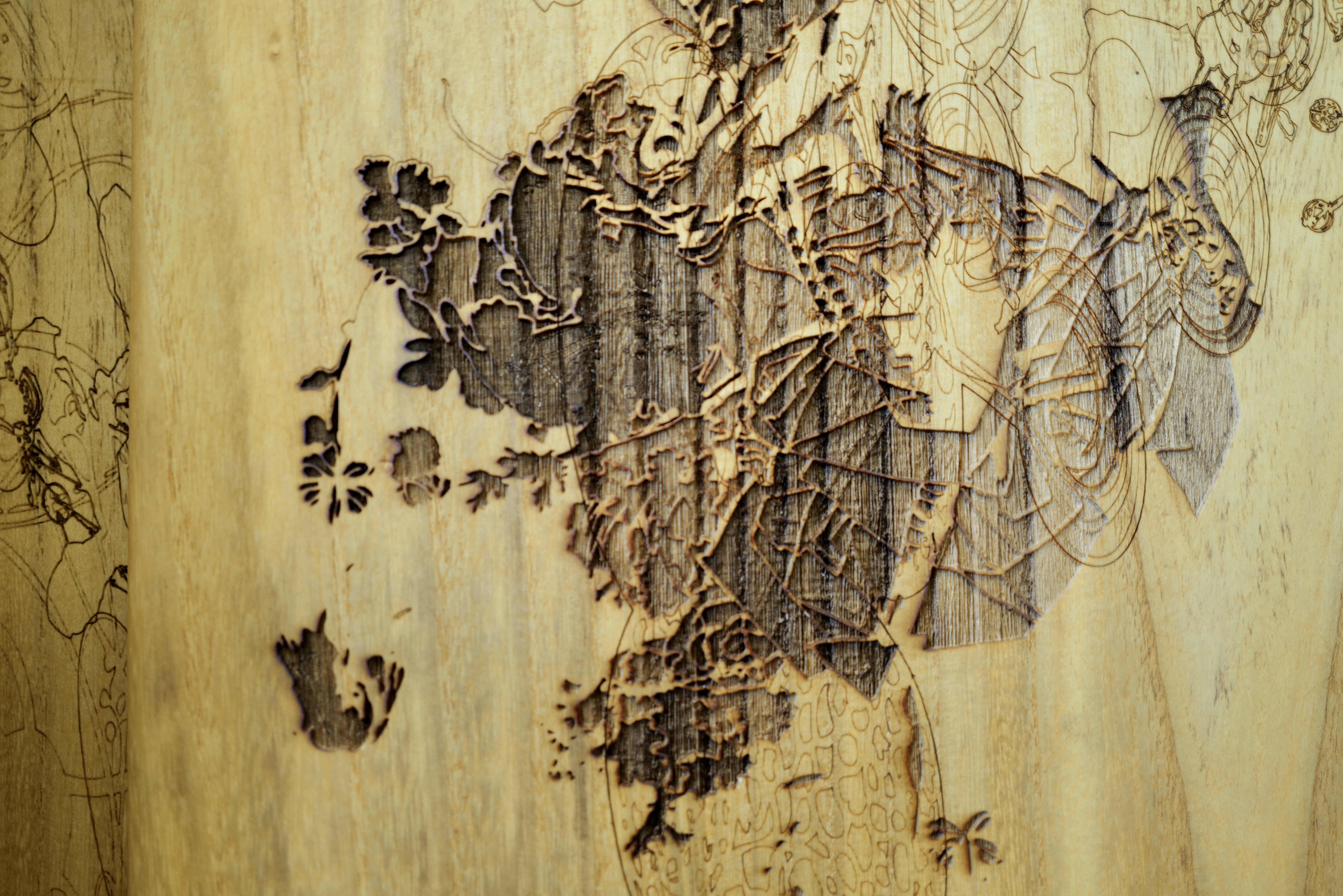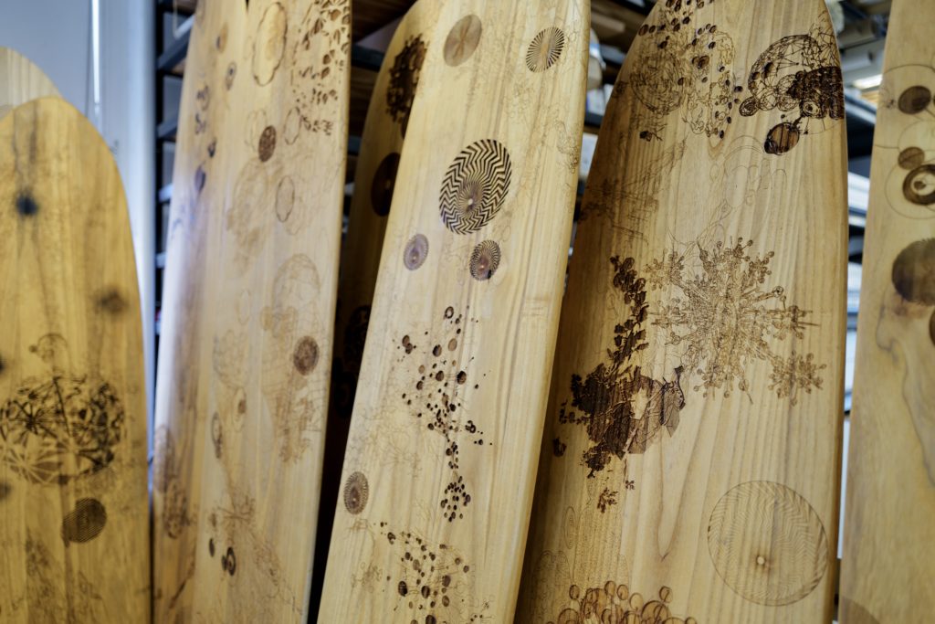 Whatever Jerry saw in Vu, this young, innocent kid, and whatever Vu saw in him, whatever that was, he wanted that connection again. Each board is hand shaped by Vu himself out of wood and coated with linseed oil. Vu’s goal is to make 210 surfboards, one for each song The Beatles released in their short eight years together–so far he has made 60. The front is the image and the back is the lyrics of the song, similar to the A-side and B-side of an album. Even though the surfboards represent a piece of his history, they also explore what the future can be, scrutinizing this idea of the man versus the machine, because as an artist he feels that it is easy to lose oneself when you don’t have that connection to the touch.